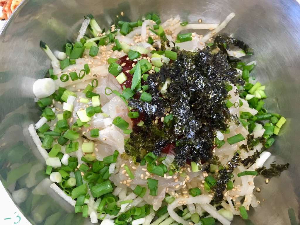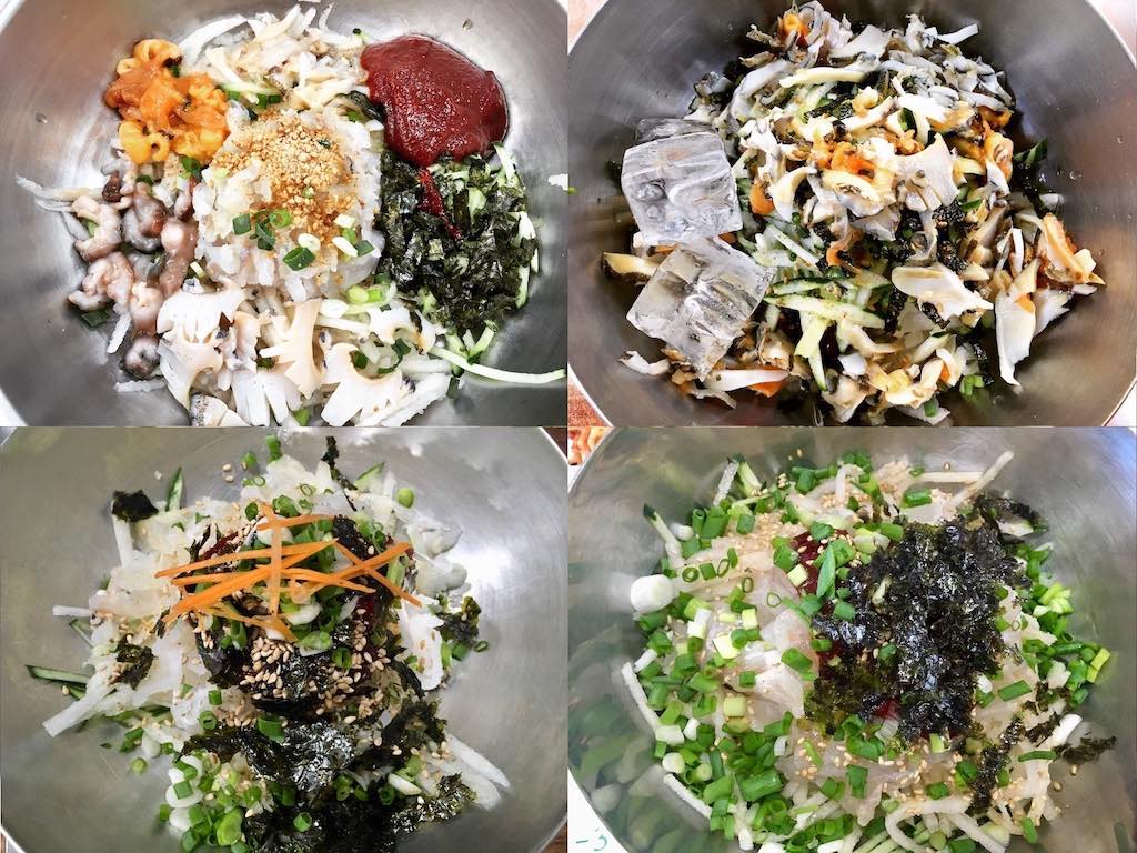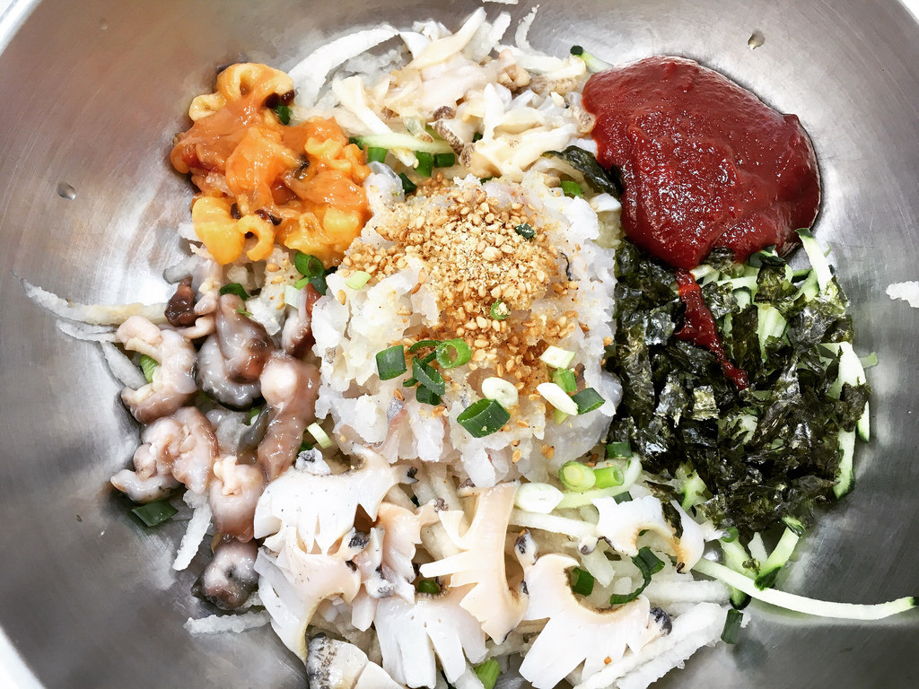 육수 없는 전통 물회. 고추장에 비벼 먹다가 생수 좀 넣어서 물회로 먹는다.