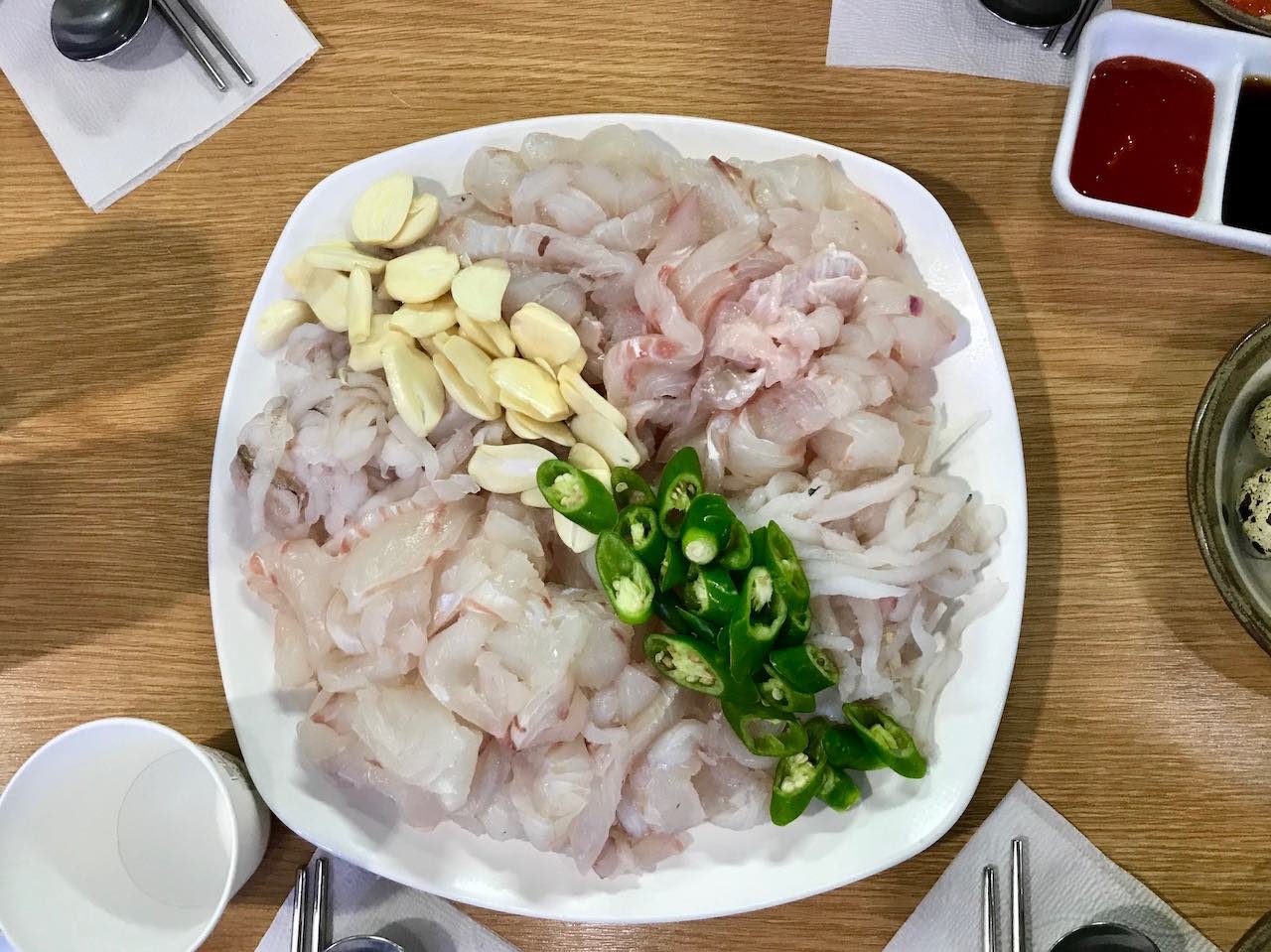 좀 다르게 생긴 지느러미부터 공략하자. 그다음은 흰 껍질 막이 붙은 배 부위를 먹자. 광어회는 실패가 없다. 아니 맛없는 회는 없다. 회는 실패가 없다.